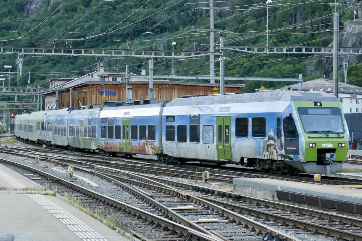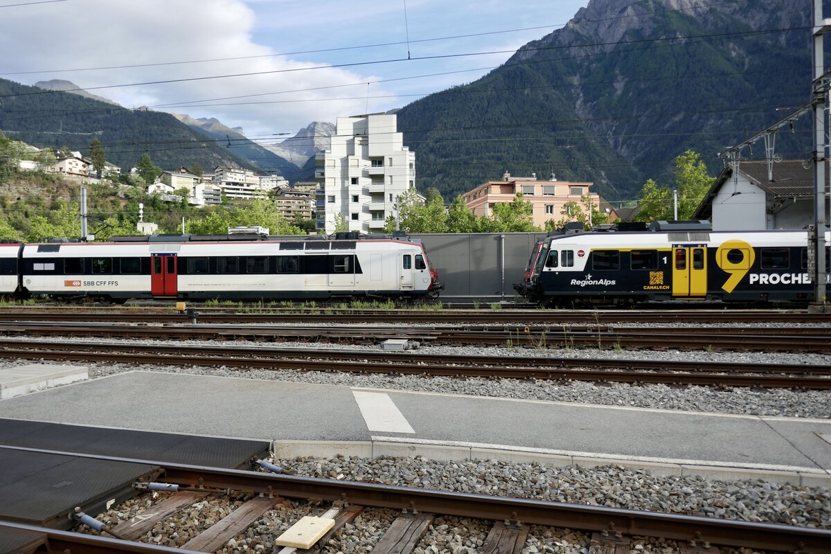 Der Domino RA14 ABt 954 mit Kanal 9 Vollwerbung am 9.12.23 bei der Einfahrt in den Bahnhof Brig.