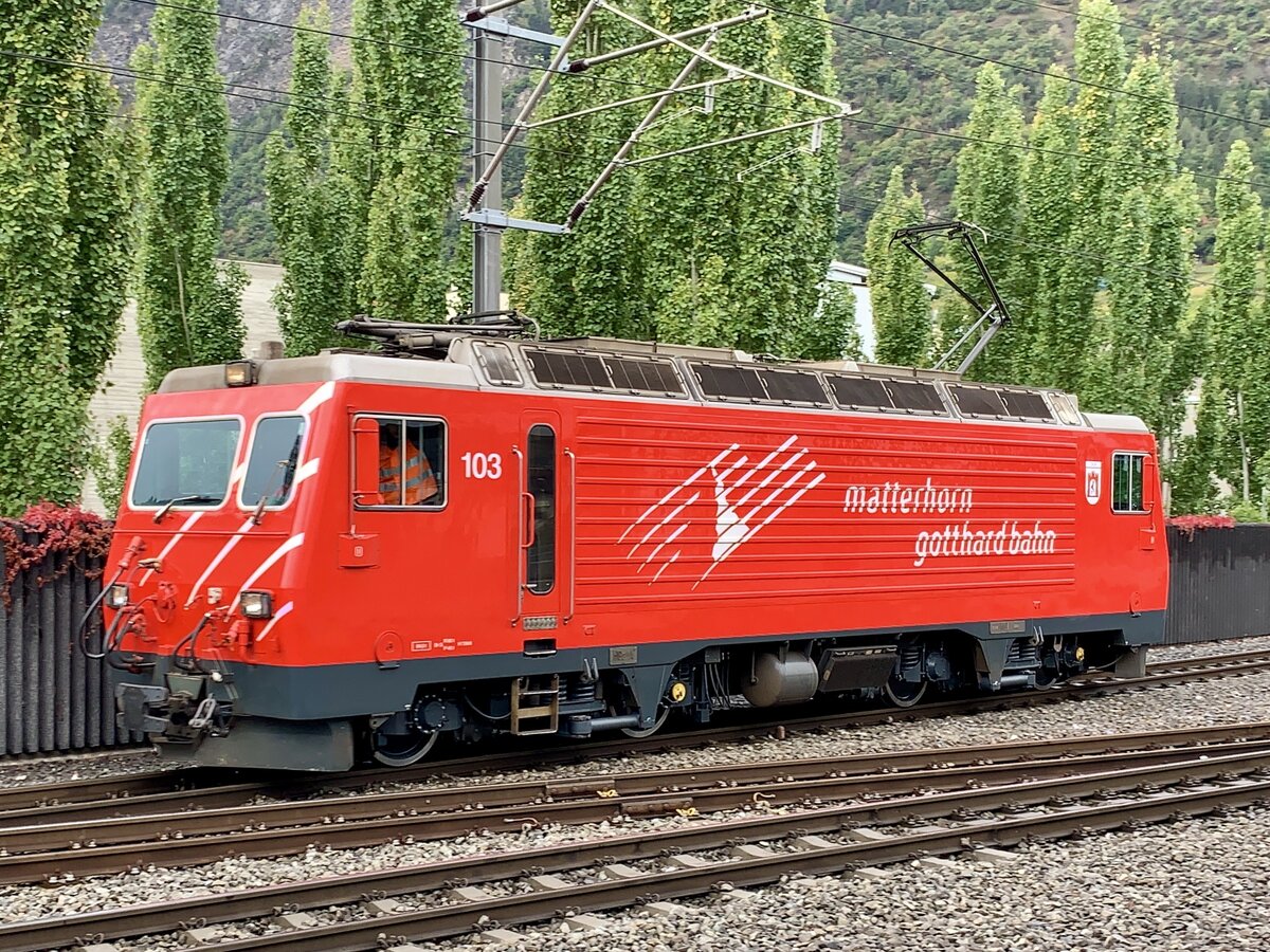 Die HGe 4/4 103  Chur  am 7.10.20 nach der Abfahrt im Bahnhof Visp.