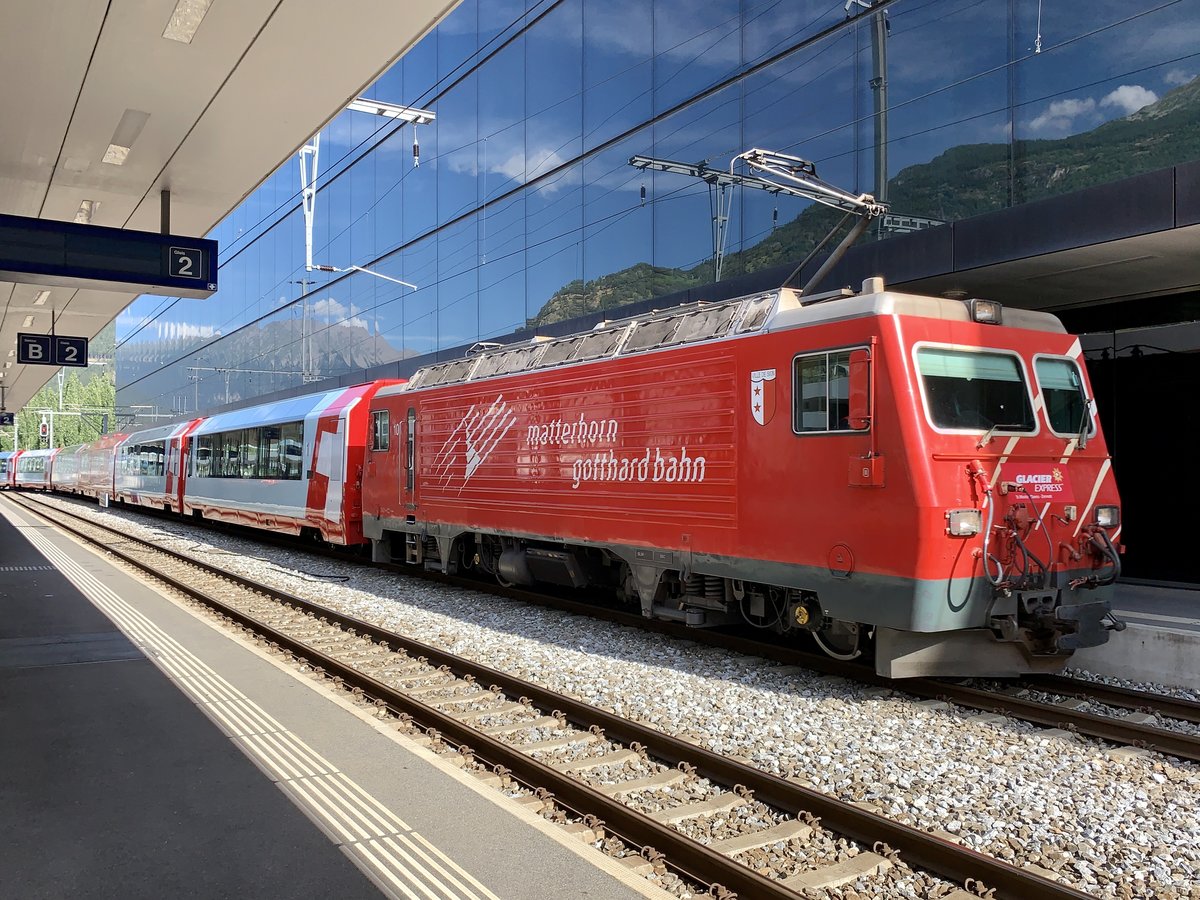MGB HGe 4/4 101  Ville de Sion  mit einem Glacier Express am 25.7.20 bei der Durchfahrt in Visp.